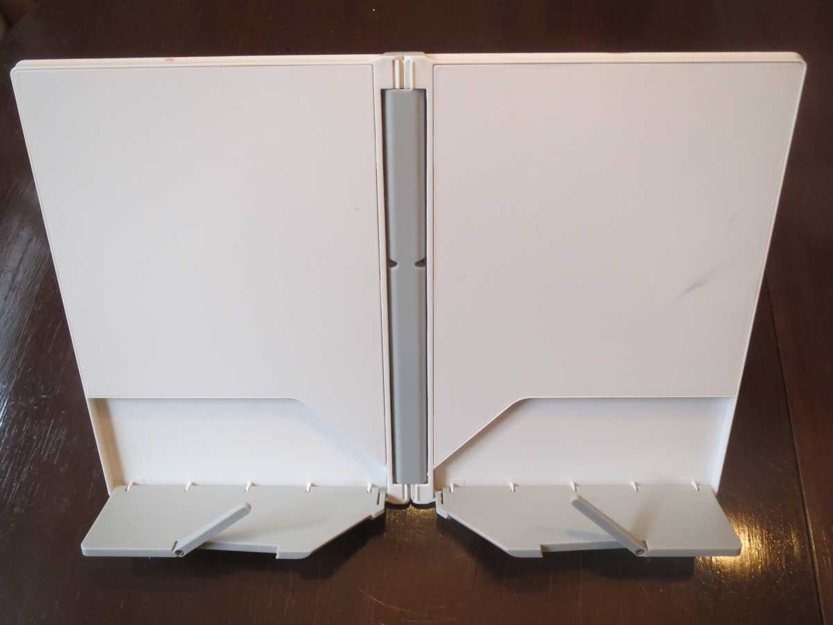 What else, there are little tabs (grey diagonal pieces coming out of the bottom) to keep the book open to the right page, so that your book stays on the right page and these tabs can be pushed down to get out of the way if they aren’t needed (say if you are reading a binder which stays open automatically). Just remember that you need to release the little tabs before trying to refold the book stand.